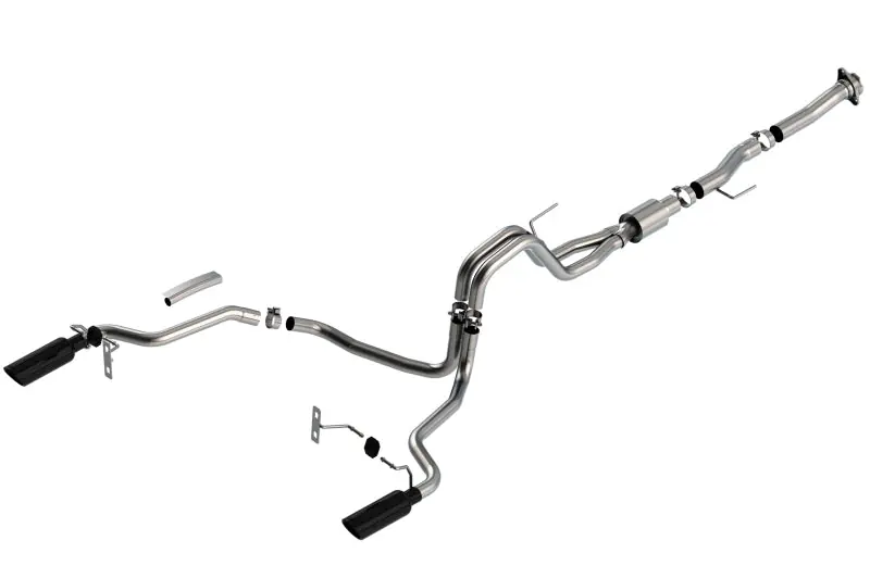 The 3″ diameter into dual 2.25″ Borla(r) Cat-Back(tm) system 14086 was specifically designed to enhance the power and sound of the Ford F-150 equipped with the 5.0L V8 engine. The split rear exit configuration replaces the single factory tail pipe, and has single 4″ round black chrome on T-304 stainless steel tips on e