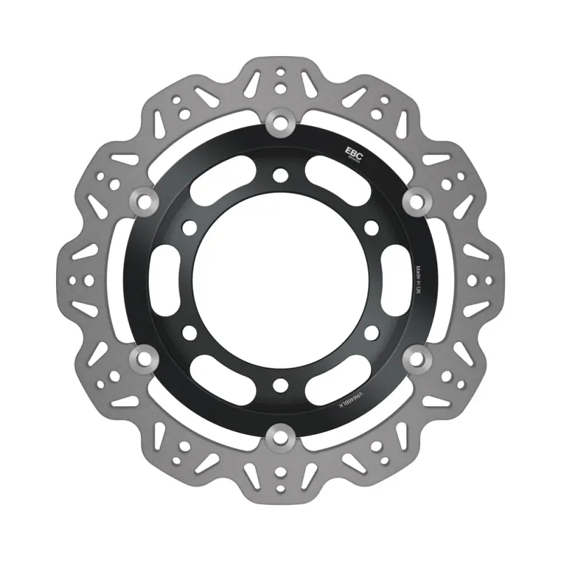 EBC Brakes™ Vee-Rotors™ Replacement Discs are British made discs using German mill rolled precision stainless steel rotor blades with a VEE profile weight reducing profile mounted onto lightweight alloy center hubs, using the patented SD square drive button technology.