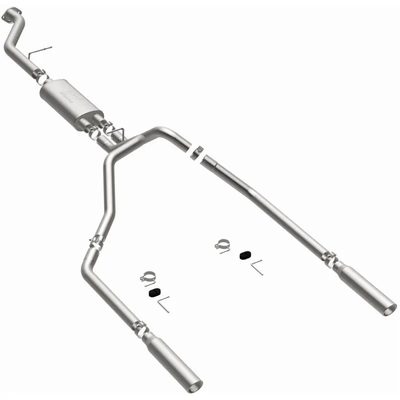 The MagnaFlow Street Series Cat-Back Performance Exhaust System 15753 brings out the personality of your Truck with our signature resonant, powerful engine tone and dyno-proven performance. Thanks to its fast-flowing, mandrel bent 3in. main piping and 1 Straight-Through mufflers ending in a Dual Split Rear exit with 3.5in. Polished Clamp-On Single Wall Angle Cut Rolled Edge tips, this Truck exhaust kit has the performance chops to match its sporty sound and appearance. Upgrade your ride to the next level with an exhaust that has the pipes to put other Truck’s to shame. With this system your vehicle will be producing Aggressive exterior and Moderate interior sound levels while leaving other cars and trucks feeling envious at every stoplight. Exhaust kit 15753 features a cat-back layout that replaces your ride’s stock exhaust components from near the catalytic converter on back. Extensive 3D scanning during development has resulted in a direct-fit design that you can easily install yourself. 15753 is produced using CNC precision robotic manufacturing techniques and is backed by MagnaFlow’s 1-year limited finish warranty and limited lifetime construction warranty.