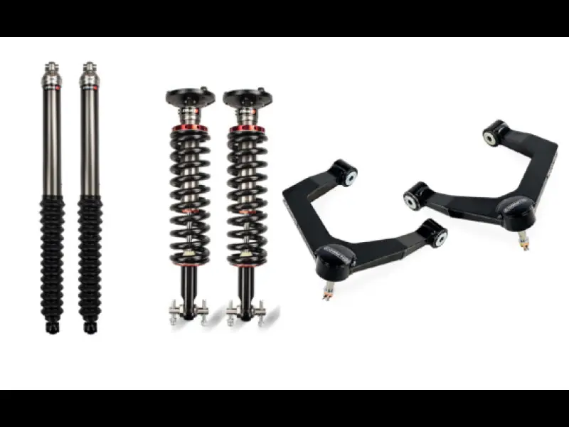 We have bundled everything you need in a leveling kit for your Silverado/Sierra 1500 2WD/4WD with high quality Cognito components.There is no guesswork. Cognito components are engineered, manufactured and assembled in the USA. The Cognito 1 inch Performance Ball Joint Leveling Kit includes the Cognito Ball Joint SM Series Upper Control Arm Kit, Elka Coilover front shocks and Elka rear shocks- all with hardware included.The Cognito Ball Joint SM Series Upper Control Arms add style, function and performance to your vehicle by improving the allowable droop travel for a better ride quality. The control arm kit features boxed sheet metal arms that are CNC robot welded and powder coated semi-gloss black.Press in ball joints are pre-installed and retained with black anodized, Cognito branded laser etched caps. New crush sleeves and polyurethane bushings are included. The Cognito Ball Joint SM Series Upper Control Arms provide ample droop travel that is required for good ride quality and all suspension components to last and work properly.The Elka 2.0 shocks feature an Internal Floating Piston design and provide better attenuation of vibration, leading to major noise reduction in the cabin (much less squeak and rattle), damping characteristics optimized for each truck and setup, providing a smoother ride. Increased comfort in both on road and off-road conditions, especially over washboard and square-edge impacts, more stable and more predictable handling, reduced front-end diving when cornering or braking reduced rear-end bucking and lifting, and increased damping and spring rate for better handling when towing or loading truck