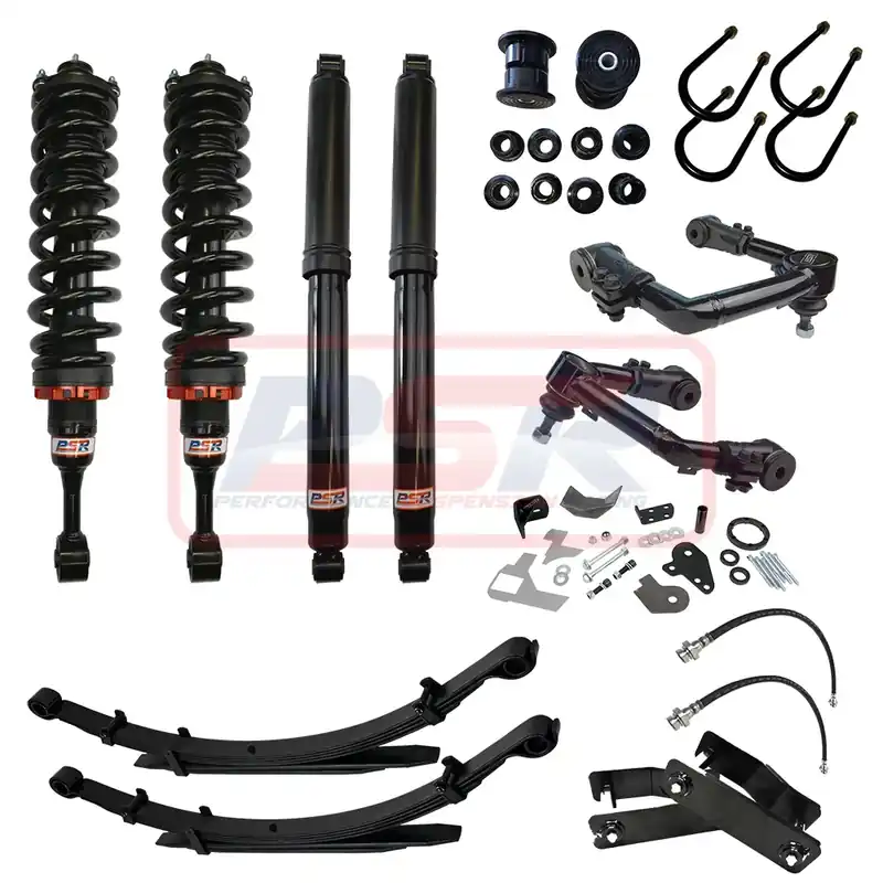This system sits at 5″ front and 3″ rear to sit the car level and includes our PSR diff drop kit, PSR Upper Control Arms, PSR TTG height adjustable 2 – 5″ struts, kings coil springs, leaf springs, leaf spring bush kit, 1″ lift extended shackles (bringing the rear level) and extended brake lines and long travel PSR TTG shocks. This kit includes our weld in diff drop which is highly recommended when raising the vehicle 3″ or above to save the CV joints from damage due the strain put on them at the increased angles.